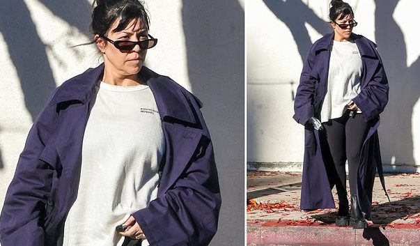 Kourtney, who recently declared she is done with Botox for a bizarre spiritual reason, had a batch of plastic-wrapped utensils in one hand and rocked a casual–chic look pairing a simple white T-shirt and black leggings with an eye-catching purple trench coat.