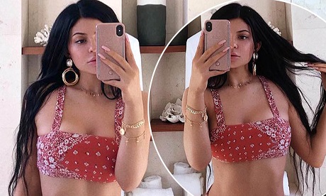 Kylie sported a patterned red bikini as she stood in the mirror and flashed a couple selfies. She left her long dark tresses unencumbered and they tumbled across her shoulders in thick waves.