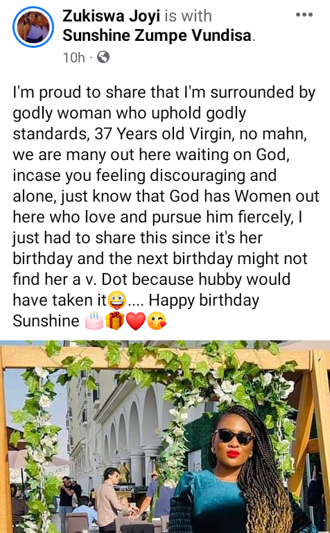 “I’m proud to share that I’m surrounded by godly woman who uphold godly standards, 37 Years old Virgin, no mahn, we are many out here waiting on God, incase you feeling discouraging and alone, just know that God has Women out here who love and pursue him fiercely, I just had to share this since it’s her birthday and the next birthday might not find her a v. Dot because hubby would have taken it…. Happy birthday Sunshine.”