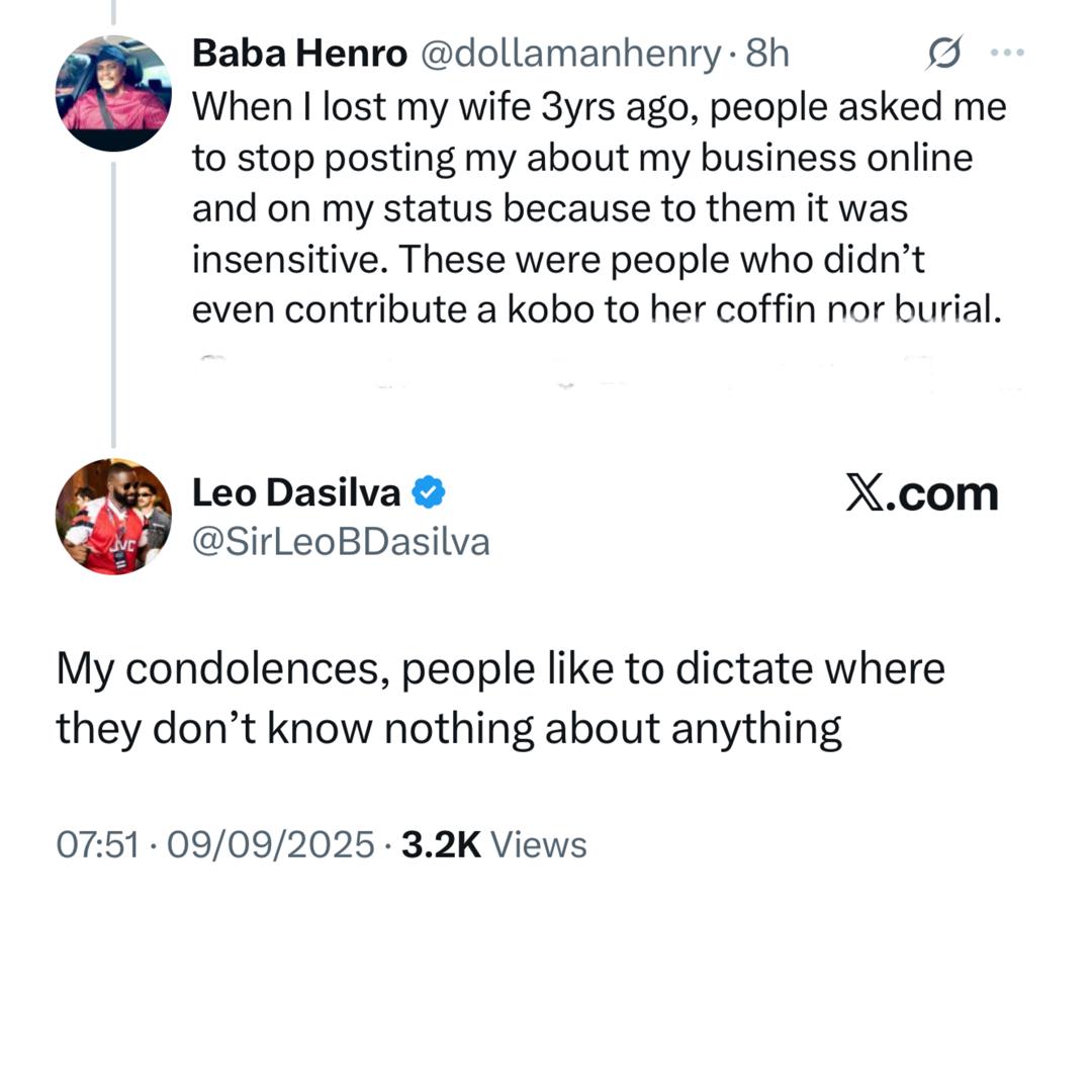 Another follower said: “When I lost my wife 3yrs ago, people asked me to stop posting about my business online and on my status because to them it was insensitive. These were people who didn’t even contribute a kobo to her coffin nor burial.” Leo replied: “My condolences, people like to dictate where they know nothing about anything.”