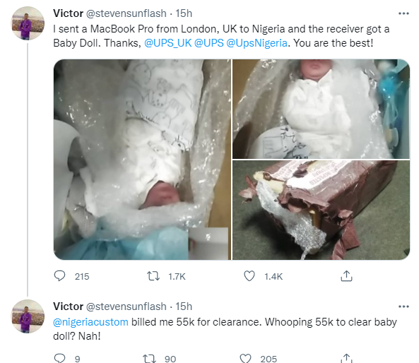 ”I sent a MacBook Pro from London, UK to Nigeria and the receiver got a Baby Doll. Thanks, @UPS_UK @UPS @UpsNigeria. You are the best!”