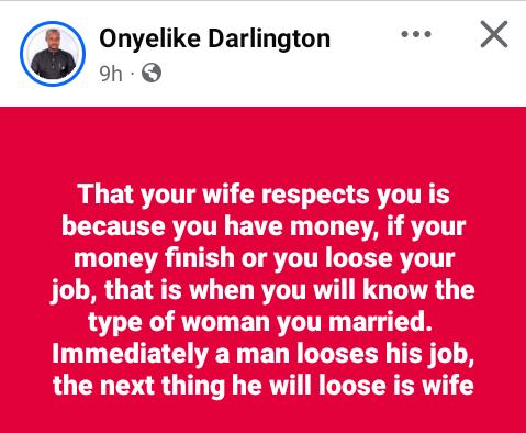 In a post on Thursday, Darlington wrote, “That your wife respects you is because you have money. If your money finishes or you lose your job, that is when you will know the type of woman you married. Immediately a man loses his job, the next thing he will lose is his wife.”