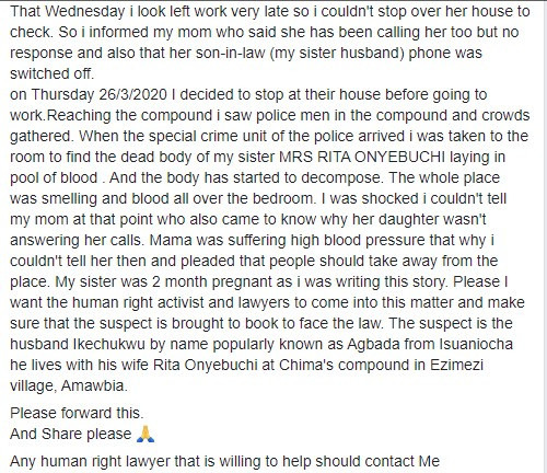 on Thursday 26/3/2020 I decided to stop at their house before going to work.Reaching the compound i saw police men in the compound and crowds gathered. When the special crime unit of the police arrived i was taken to the room to find the dead body of my sister MRS RITA ONYEBUCHI laying in pool of blood . And the body has started to decompose. The whole place was smelling and blood all over the bedroom.
