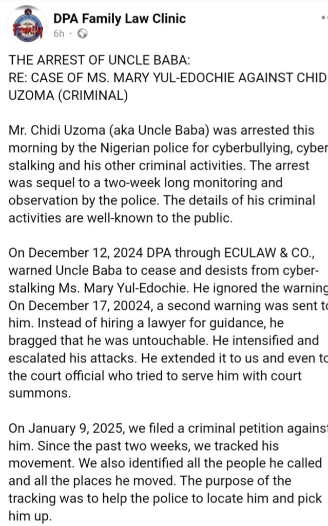 The arrest comes after Baba De Baba made serious allegations against businesswoman May Edochie and her lawyer, Emeka Ugwuonye.