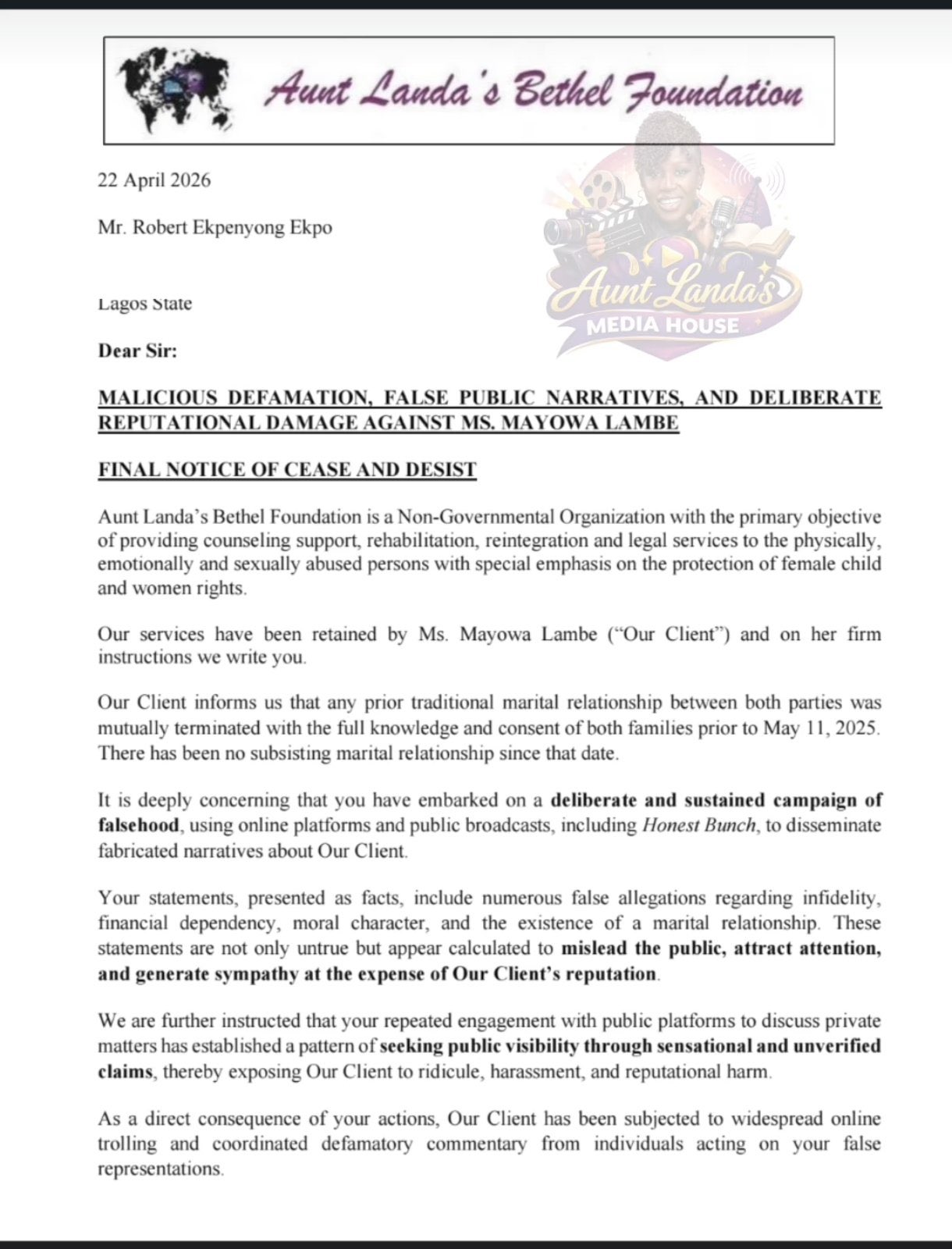 Mayowa maintains that Ekpo has turned private matters into public spectacle, repeatedly discussing their past in a way that has exposed her to online attacks, ridicule, and reputational damage. The document claims this pattern of behavior has encouraged harassment from social media users who relied on his version of events.