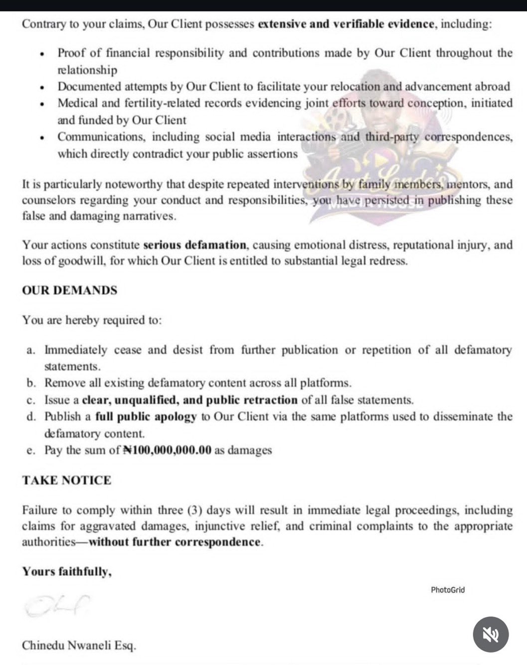 As part of the demands outlined in the notice, Ekpo has been instructed to immediately stop making any further statements about her, delete all existing content deemed defamatory, issue a clear public retraction and apology on the same platforms, and pay ₦100 million in damages.