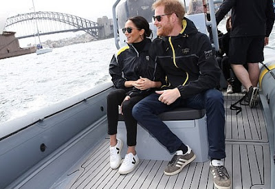 Pregnant Meghan, 37, swapped her favoured sky high stilettos for a pair of trainers as the couple headed out on a boat to watch a sailing race in Sydney Harbour.