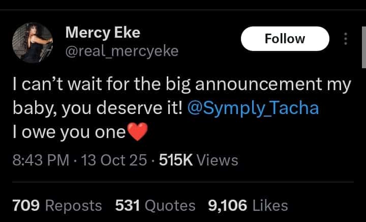 Mercy took to social media to congratulate Tacha, saying, “I can’t wait for the big announcement, my baby, you deserve it! @Symply_Tacha I owe you one”.