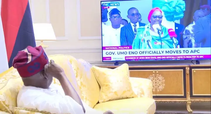 President Bola Ahmed Tinubu personally watched the live broadcast of Governor Umo Eno’s defection from the Peoples Democratic Party (PDP) to the All Progressives Congress (APC)