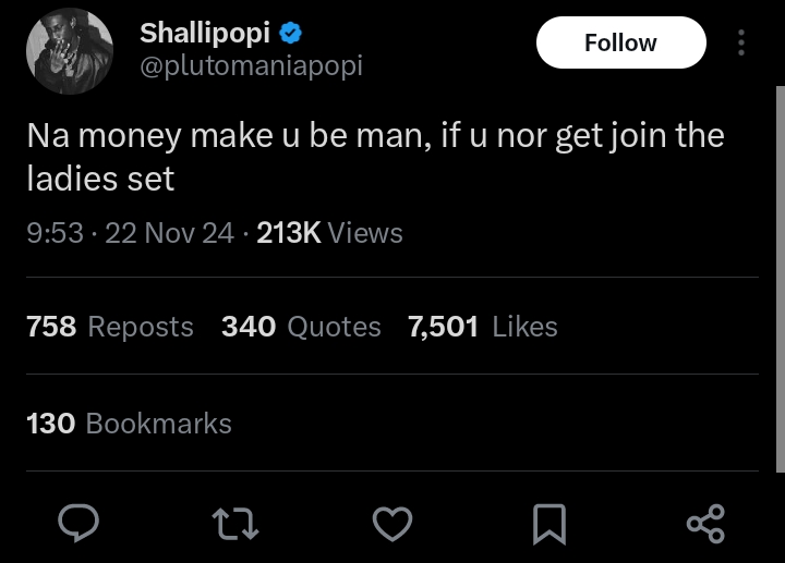 In his second post, Shallipopi took a more assertive tone, statimg that having money is a key factor in being considered a man, and that those without financial means may be relegated to a female status.