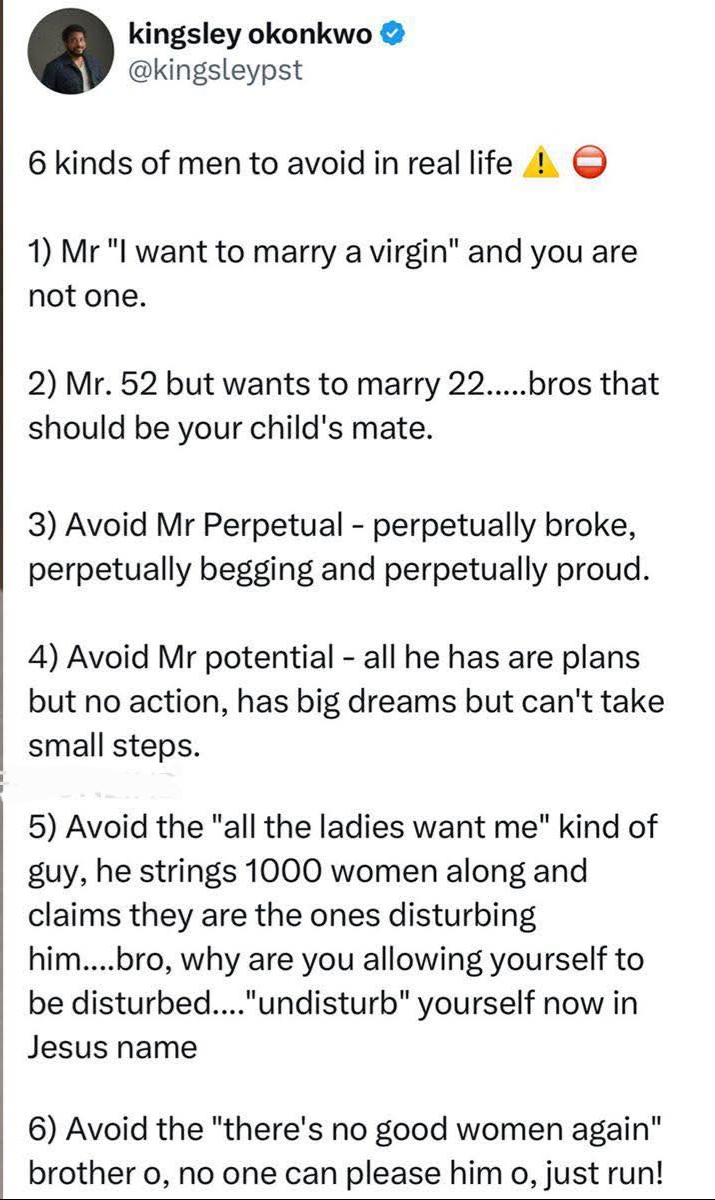 Pastor Kingsley Okonkwo recently shared a list of six kinds of men to avoid and that definitely has everyone paying attention, most especially women.