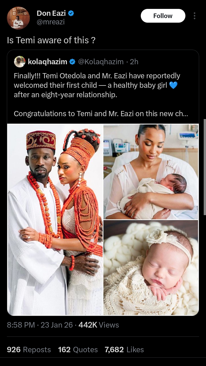 As of now, neither Mr Eazi nor Temi Otedola has officially confirmed having a child, though the couple often shares glimpses of their life together on social media.