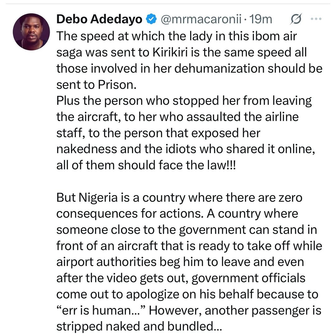 He went on to draw a stark comparison with the swift punishment faced by a woman involved in a recent Ibom Air incident. “The speed at which the lady in this Ibom Air saga was sent to Kirikiri is the same speed all those involved in her dehumanization should be sent to prison,” Macaroni said.
