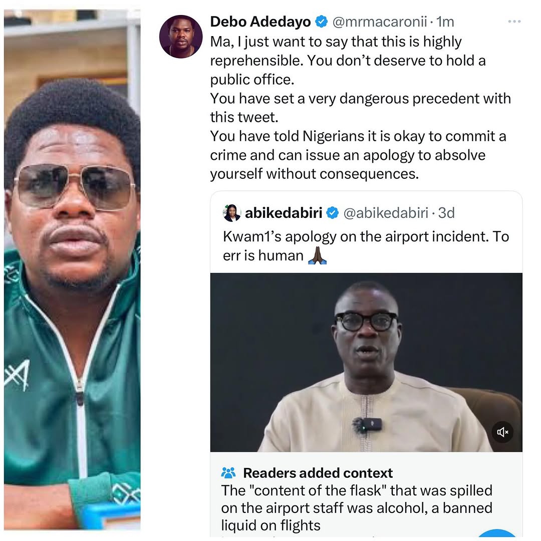 In a pointed response, Macaroni wrote, “Ma, I just want to say that this is highly reprehensible. You don’t deserve to hold a public office. You have set a very dangerous precedent with this tweet.” He accused her of telling Nigerians that committing a crime could be absolved simply by issuing an apology, without facing any real consequences.