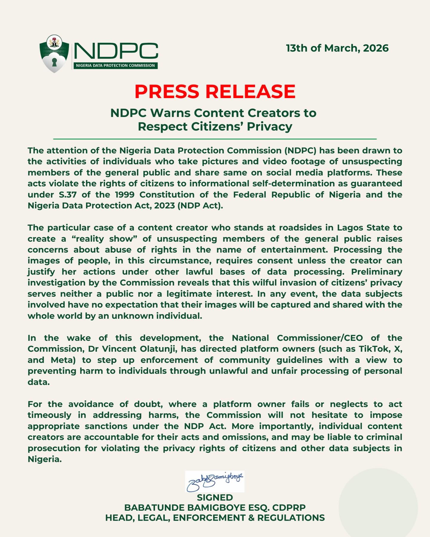 The Nigeria Data Protection Commission (NDPC) has cautioned content creators against recording unsuspecting members of the public and posting the footage on social media, warning that the practice violates citizens’ privacy right.
