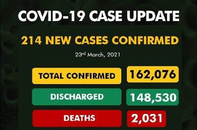 The Nigeria Centre for Disease Control (NCDC) has recorded 214 new cases of COVID-19, bringing the total number of infections in the country to 162,076.