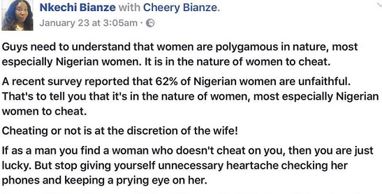Oh dear, this is a NEW ONE. Hahaha we have heard it all, but we haven’t heard this. God forgive me, 95% of Nigerian men, youths, adults o are polygamous in nature. So if women are saying they also want to be polygamous now, lol, I go with them, afterall, it’s 2017. My mind just told me I have committed a sin (God forgive me, just can’t see myself deleting that last statement) 😀