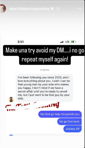 Nkechi Blessing has called out a man who boldly asked for a secret affair via her DM
