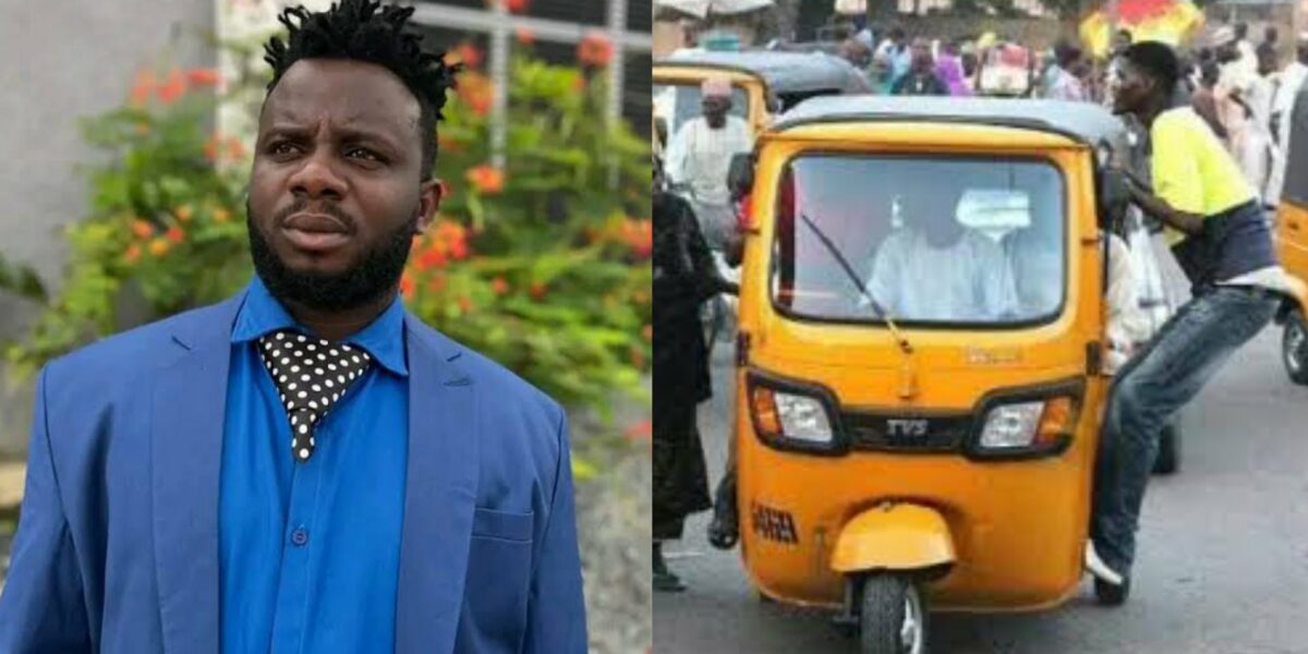 Comedian Sabinus has lamented about tricycle riders, saying none that he has seen has his senses in place