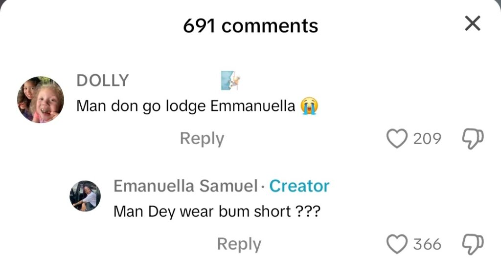 The young comedian took to social media to respond to a comment from a TikToker named Dolly, who had written “Man don go lodge Emmanuella”.