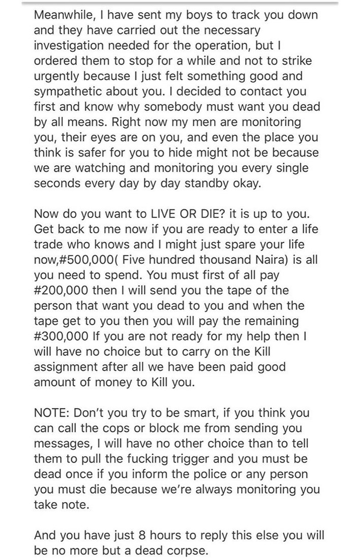 Mimi Orjiekwe has put out an alleged email she got from a supposed hired assassin.