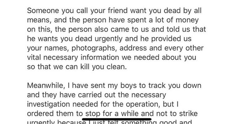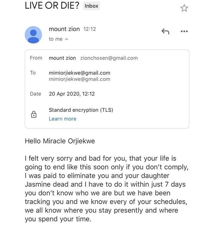 ”Mr Assassin I know the lockdown hasn’t been good but this route isn’t the best .. I know you re hungry .. Dm I may just help out.. if Really somebody sent you .. he would pay you well knowing my worth.. and you won’t be here threatening me for a little 500k and even negotiating with 200k lol .. Mr baby assassin my name is not miracle actually.. i wanted to reply your email and track you but no need wasting my precious time .. you obviously don’t know me .. if you do you would know I haven’t stepped out of my house a whole 3 weeks ..I live in a secured estate .. and I ve 2 private securities .. so pls you can come over tomorrow.. see ya !!.. you took my email from my profile .. am sure you will see this.. Take it easy .. is actually Covid19’s fault not jasmine and I.. Anuofia..🙅🏻♀️”