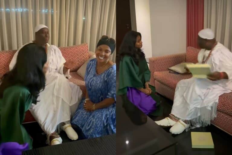 The mother-daughter duo were warmly received by the monarch, with Priscilla kneeling before him to present the wedding invitation, as seen in a video shared on Iyabo Ojo’s Instagram page.