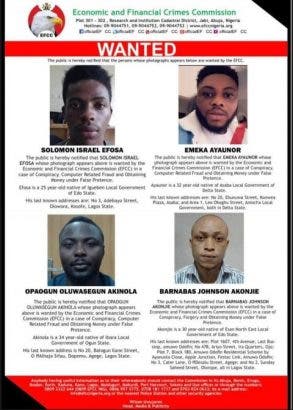 The four accused fraudsters her being hunted and wanted by the EFCC. The public is also enjoined to report any information or whereabouts of the above men.