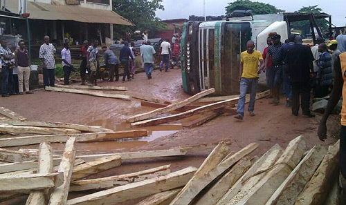 The woman believed to be waiting for the market to open for business as she got there early hours of the morning was crushed to death when a truck carrying timber, slipped off a dirt road and fell. Unfortunately, the truck fell on her and she died instantly.