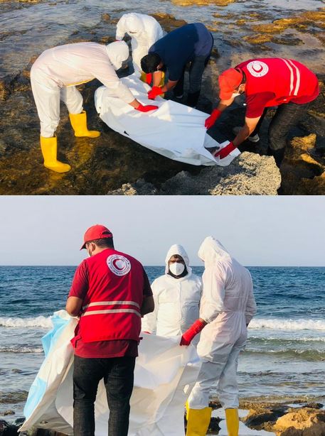 The Red Crescent posted images on Facebook that show its workers carrying white body bags with the Mediterranean Sea in the background.