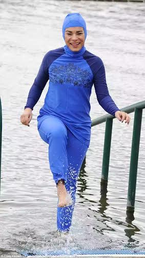 The company explains that the £49.50 suit ‘covers the whole body with the exception of the face, hands and feet, without compromising on style’ and boasts: ‘It’s lightweight so you can swim in comfort.’