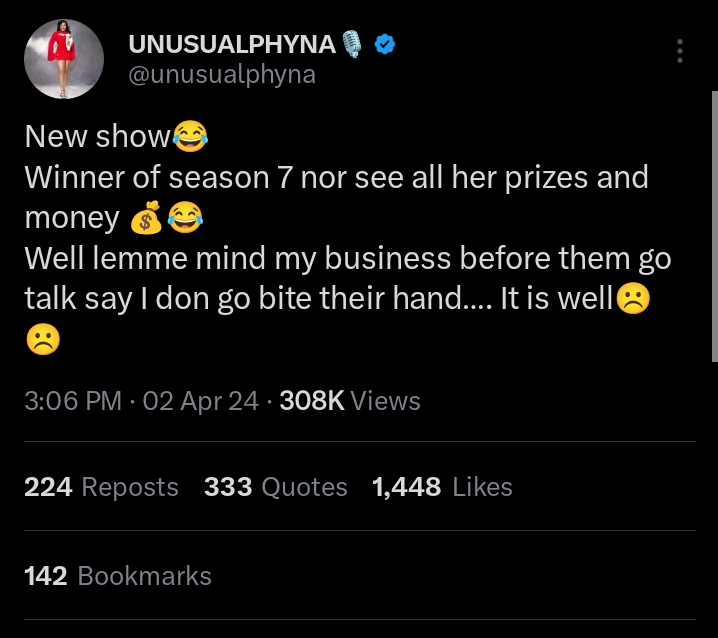 Ha! Former BBNaija winner, Phyna, has called out organisers of the show saying they are yet to redeem her prizes including her money