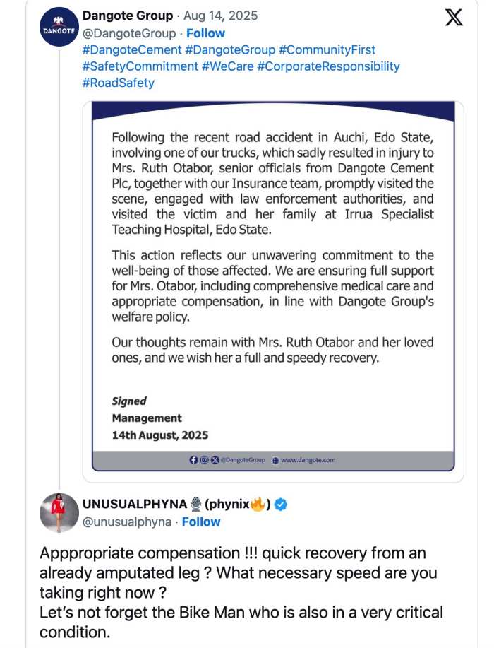 Ex-BBN housemate, Phyna has blasted Dangote Group’s statement regarding the accident involving her sister and one of the company’s trucks
