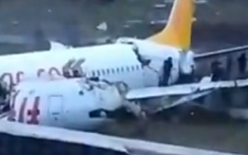 Television footage shows serious damage to the fuselage, with passengers being evacuated through the cracks. The plane belongs to Turkish airline Pegasus.