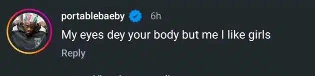 In the comment section, Portable openly expressed his attraction to the actress, stating, “My eyes dey your body, but me I like girls.”