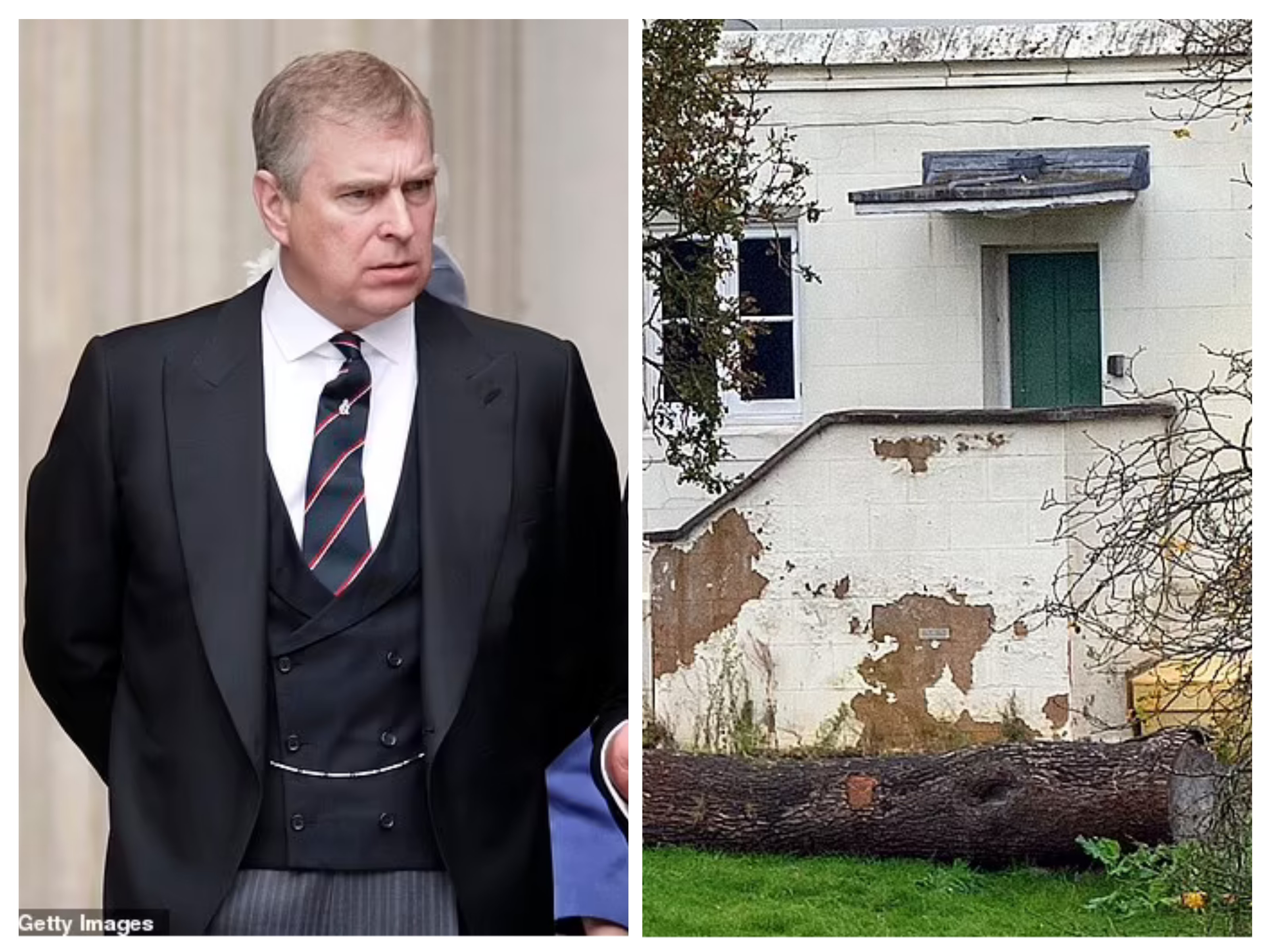Prince Andrew’s Windsor mansion is showing visible signs of neglect, with cracks and black mold appearing on the exterior walls.