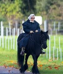 She wore riding gloves, a white scarf, a blue coat and black sunglasses on her ride yesterday.