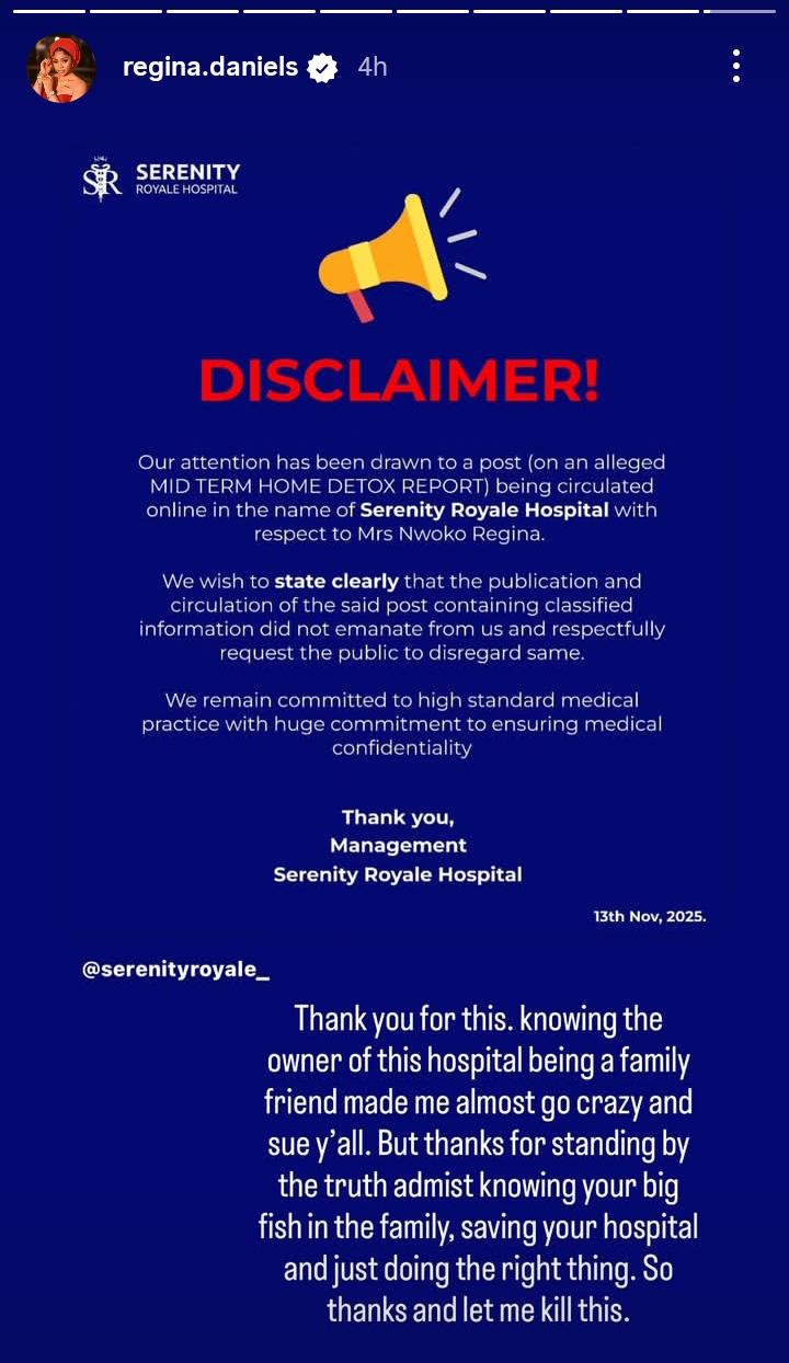 “DISCLAIMER! Our attention has been drawn to a post (on an alleged MID TERM HOME DETOX REPORT) being circulated online in the name of Serenity Royale Hospital with respect to Mrs Nwoko Regina. We wish to state clearly that the publication and circulation of the said post containing classified information did not emanate from us and respectfully request the public to disregard same. We remain committed to high standard medical practice with huge commitment to ensuring medical confidentiality. Thank you, Management Serenity Royale Hospital.”