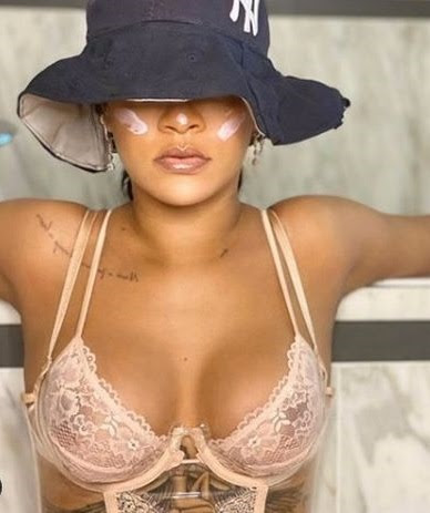 Rihanna shows off her chest tattoo as she poses in a lace bra