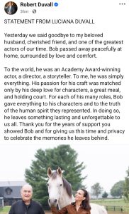 In a heartfelt Facebook post, his wife Luciana wrote, “Yesterday we said goodbye to my beloved husband, cherished friend, and one of the greatest actors of our time.
