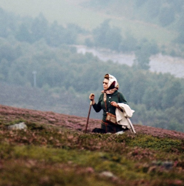 The beautiful surroundings stretched out behind her Majesty as she soldiered on up a hill, carrying a hiking stick with her and dressed in a green coat and headscarf.