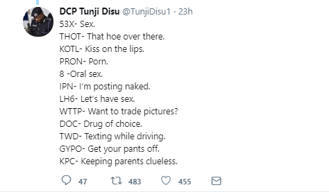 Oh dear! RRS commander, Tunji Disu has revealed new codes teens now use to address one another codedly. He revealed this on twitter, and mehn.. this is on a new level.