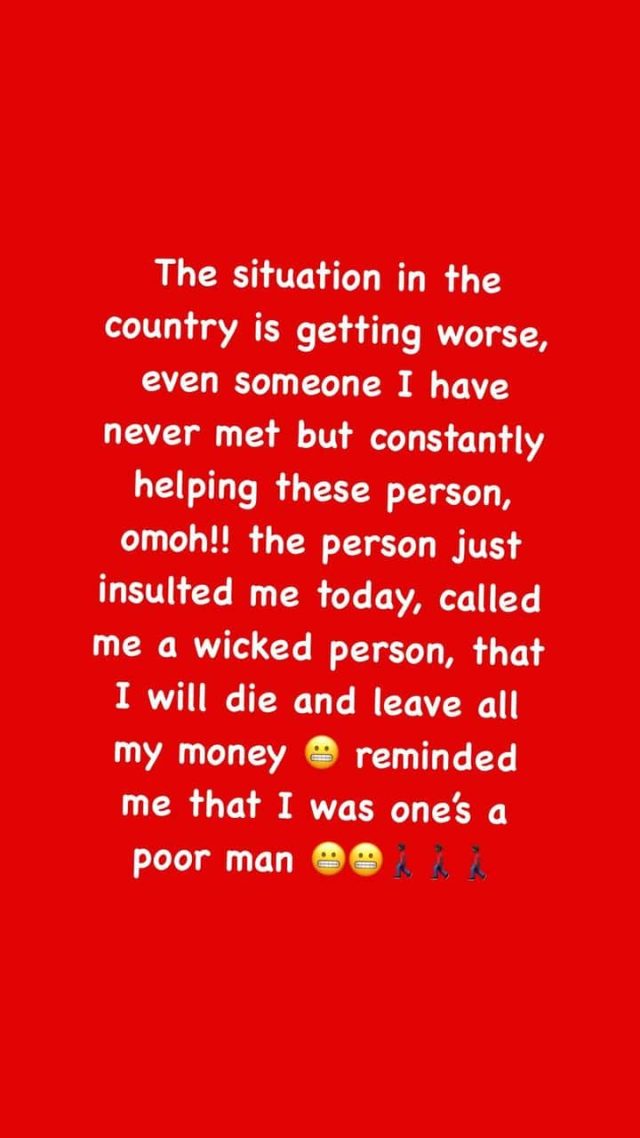 His words: “The situation in the country is getting worse, even someone I have never met but constantly helping these person, omoh!! the person just insulted me today, called me a wicked person that I will die and leave all my money reminded me that I was one’s a poor man. I need to increase the volume of my wickedness.”