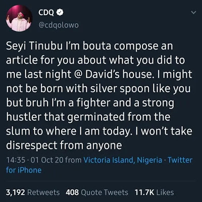 CDQ has called Seyi Tinubu put on social media saying the politician’s son ridiculed him at Davido’s house yesterday.
