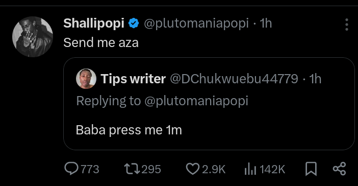 The conversation that led to the generous gift began when the user, identified as Donald Chukwuebuka, replied to Shallipopi’s post, saying “Baba press me 1m”