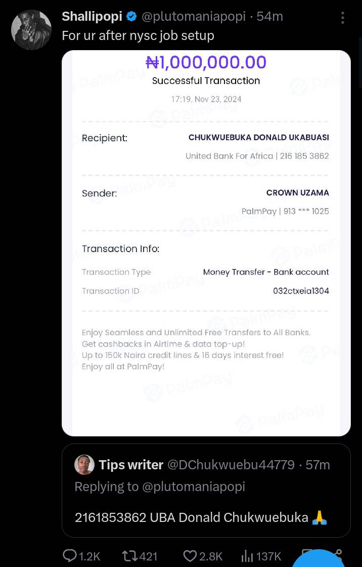 The user promptly provided his UBA account number, and to his surprise, Shallipopi sent him a screenshot of the ₦1 million transfer.
