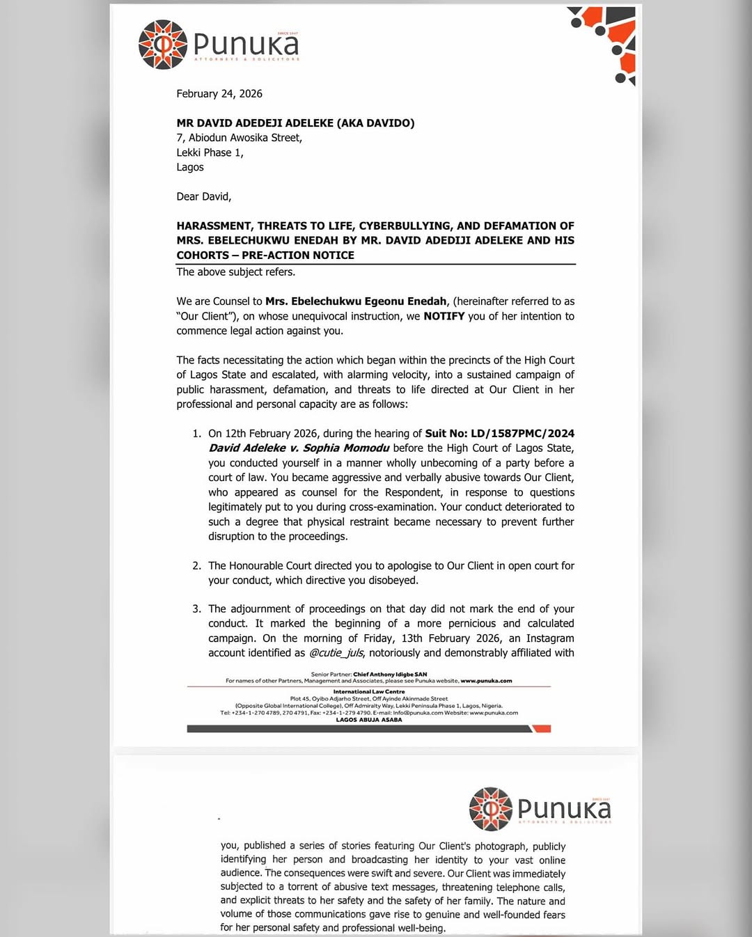 The notice further claims that following the hearing, an Instagram account linked to Davido shared Momodu’s photo and identity with his large online audience, triggering a barrage of threatening messages and abusive communications. Davido is also accused of posting defamatory content on his verified social media accounts, falsely questioning Momodu’s lawyer professional competence and publicly tagging her, which allegedly encouraged his followers to harass her.