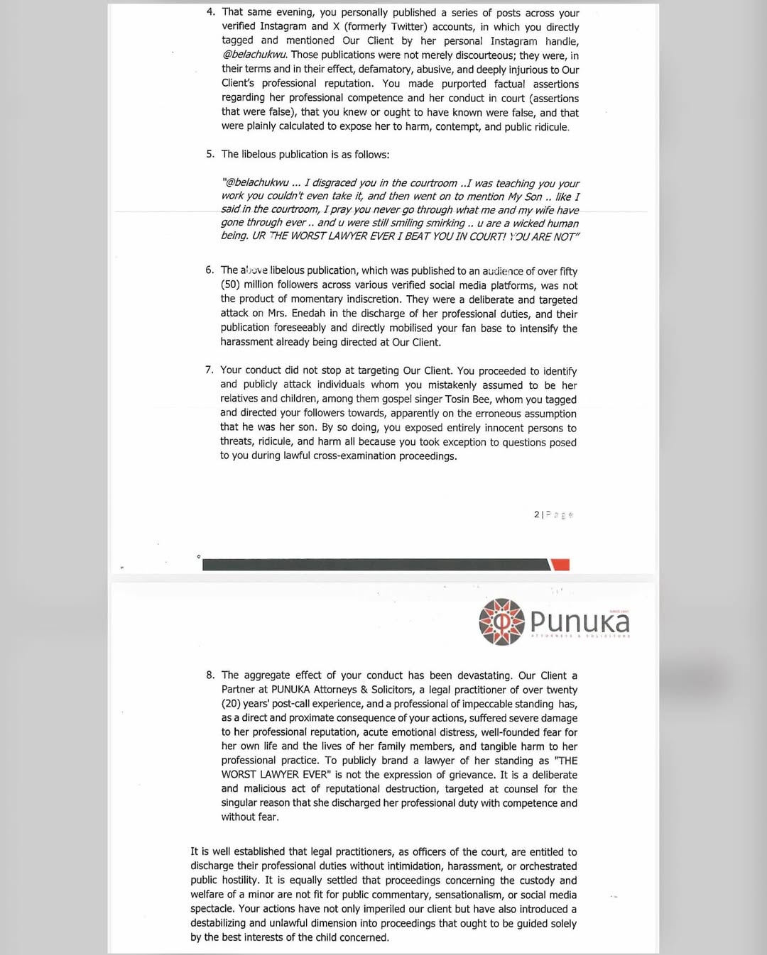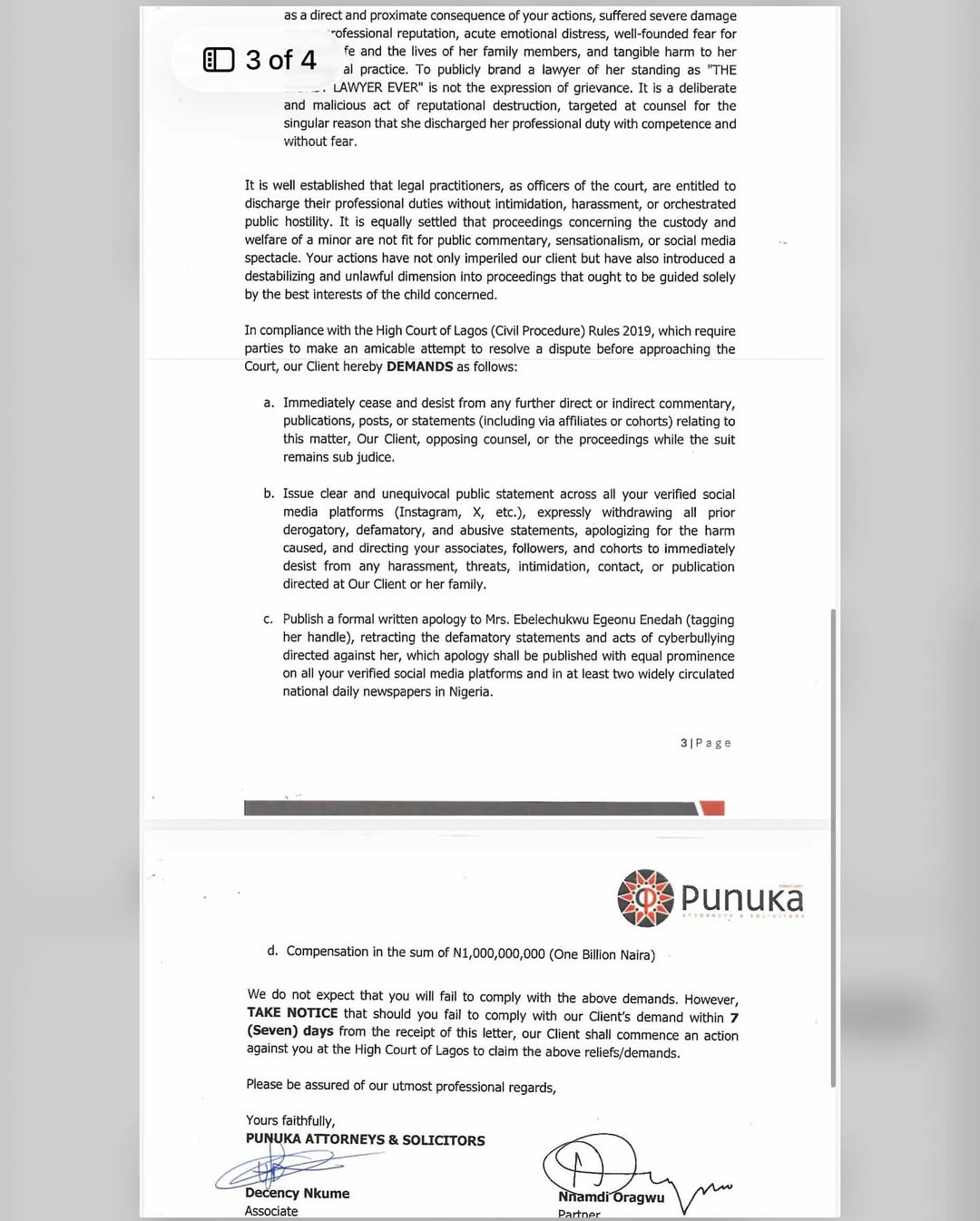 Failure to comply within seven days will prompt the commencement of legal action at the High Court of Lagos.