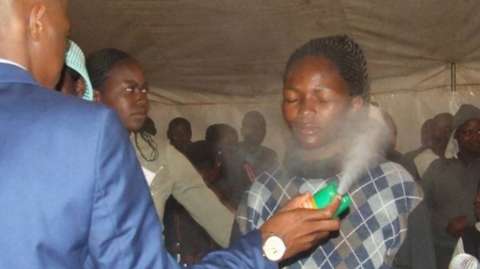 Lethebo Rabalago has been spraying it in the faces of congregants, telling them