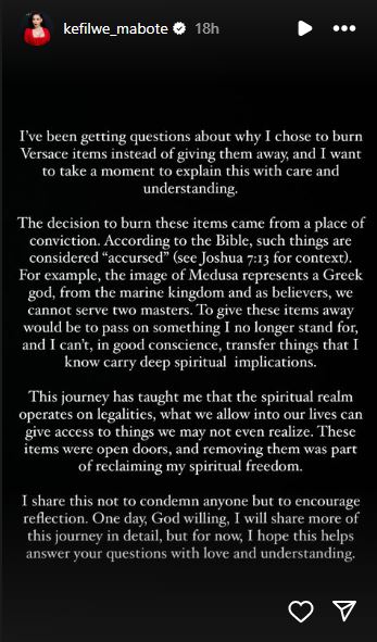 South African media personality Kefilwe Mabote has shed light on her recent decision to destroy her expensive designer clothes, including Versace items, by burning them